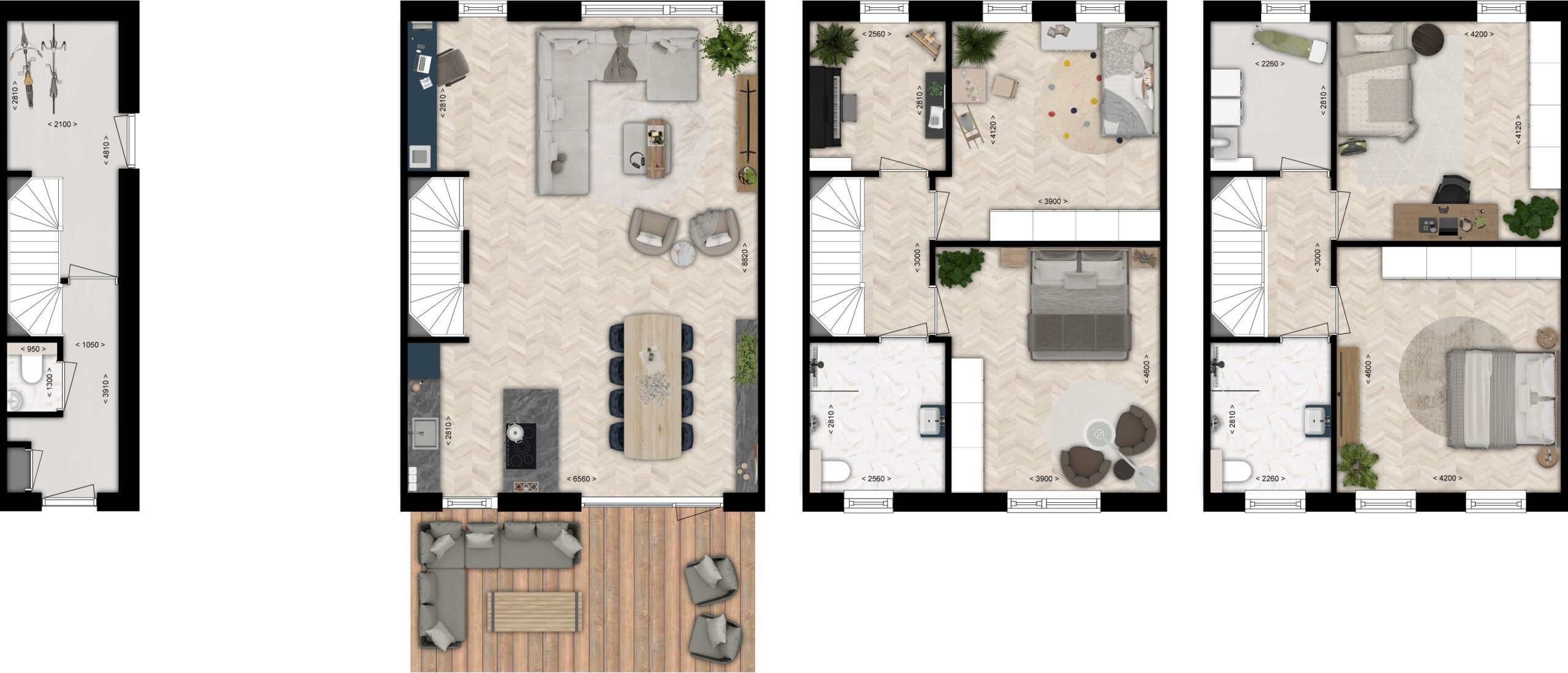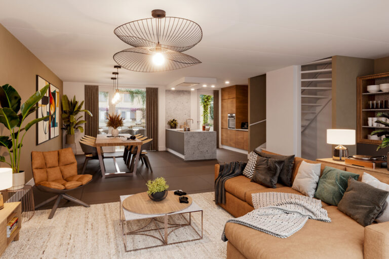 Verdeeld over vier lagen combineert de woning comfort en flexibiliteit. In het souterrain vind je een berging. Op de begane grond vind je een lichte, open woonkamer met keuken, van waaruit je via grote deuren direct het terras bereikt. De eerste verdieping telt twee riante slaapkamer, de badkamer en nog een kleinere kamer. Op de tweede verdieping vind je twee slaapkamers en een kleinere kamer, bijvoorbeeld te gebruiken als wasruimte.