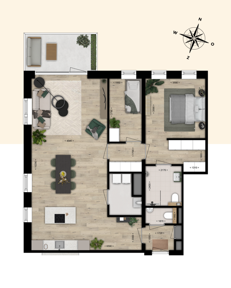 Het appartement beschikt over twee slaapkamers, een luxe badkamer en een apart toilet. Daarnaast is er een extra technische ruimte met aansluitingen voor onder andere de wasmachine. De ruime, open woonkamer met moderne leefkeuken biedt directe toegang tot het balkon.