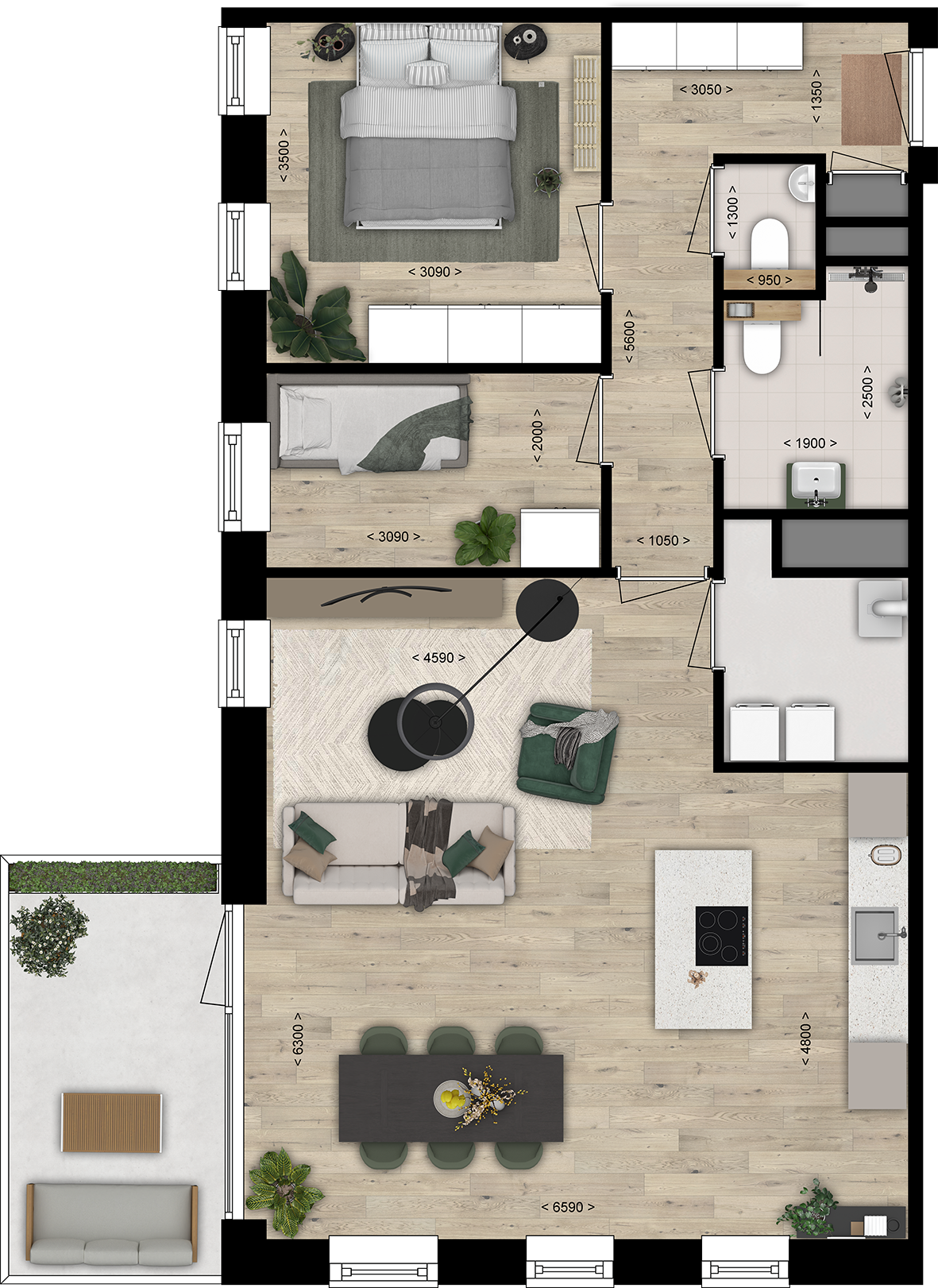 Het appartement beschikt over twee slaapkamers, een luxe badkamer en een apart toilet. Daarnaast is er een extra technische ruimte met aansluitingen voor onder andere de wasmachine. De ruime, open woonkamer met moderne leefkeuken biedt directe toegang tot het balkon.