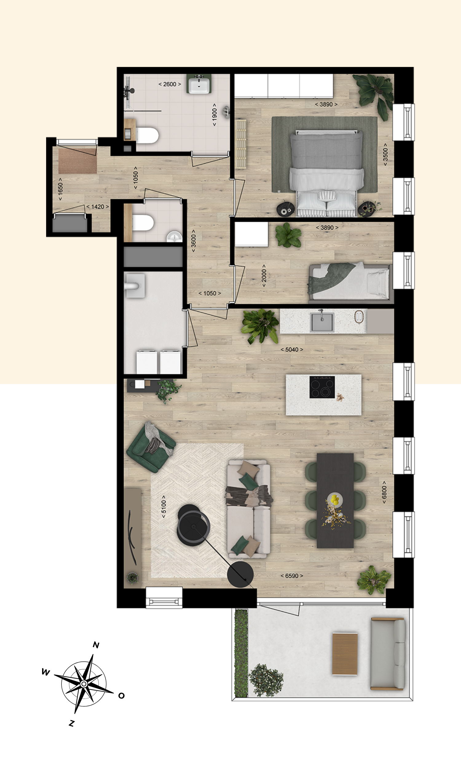 Het appartement beschikt over twee slaapkamers, een luxe badkamer en een apart toilet. Daarnaast is er een extra technische ruimte met aansluitingen voor onder andere de wasmachine. De ruime, open woonkamer met moderne leefkeuken biedt directe toegang tot het balkon.