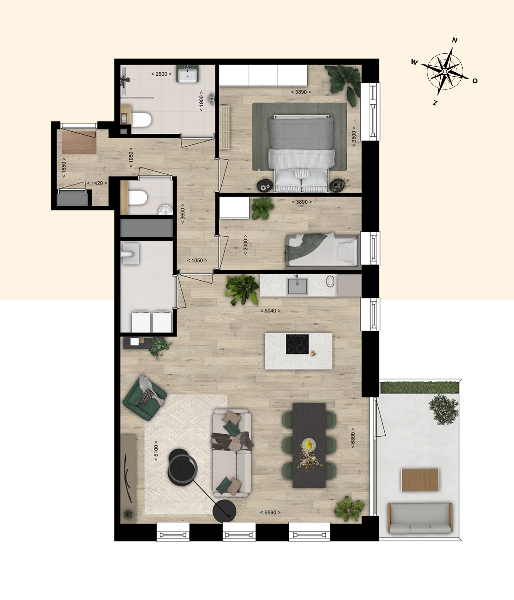 Het appartement beschikt over twee slaapkamers, een luxe badkamer en een apart toilet. Daarnaast is er een extra technische ruimte met aansluitingen voor onder andere de wasmachine. De ruime, open woonkamer met moderne leefkeuken biedt directe toegang tot het balkon.