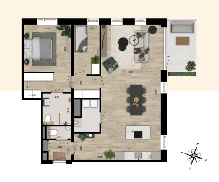 Het appartement beschikt over twee slaapkamers, een luxe badkamer en een apart toilet. Daarnaast is er een extra technische ruimte met aansluitingen voor onder andere de wasmachine. De ruime, open woonkamer met moderne leefkeuken biedt directe toegang tot het balkon.