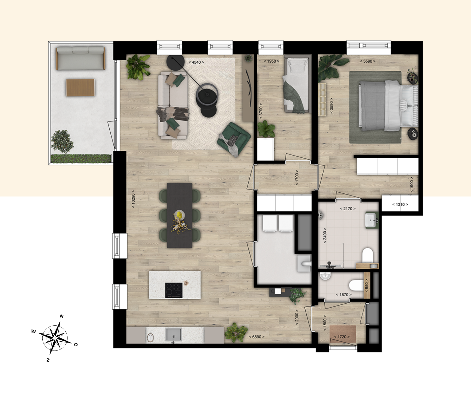 Het appartement beschikt over twee slaapkamers, een luxe badkamer en een apart toilet. Daarnaast is er een extra technische ruimte met aansluitingen voor onder andere de wasmachine. De ruime, open woonkamer met moderne leefkeuken biedt directe toegang tot het balkon.