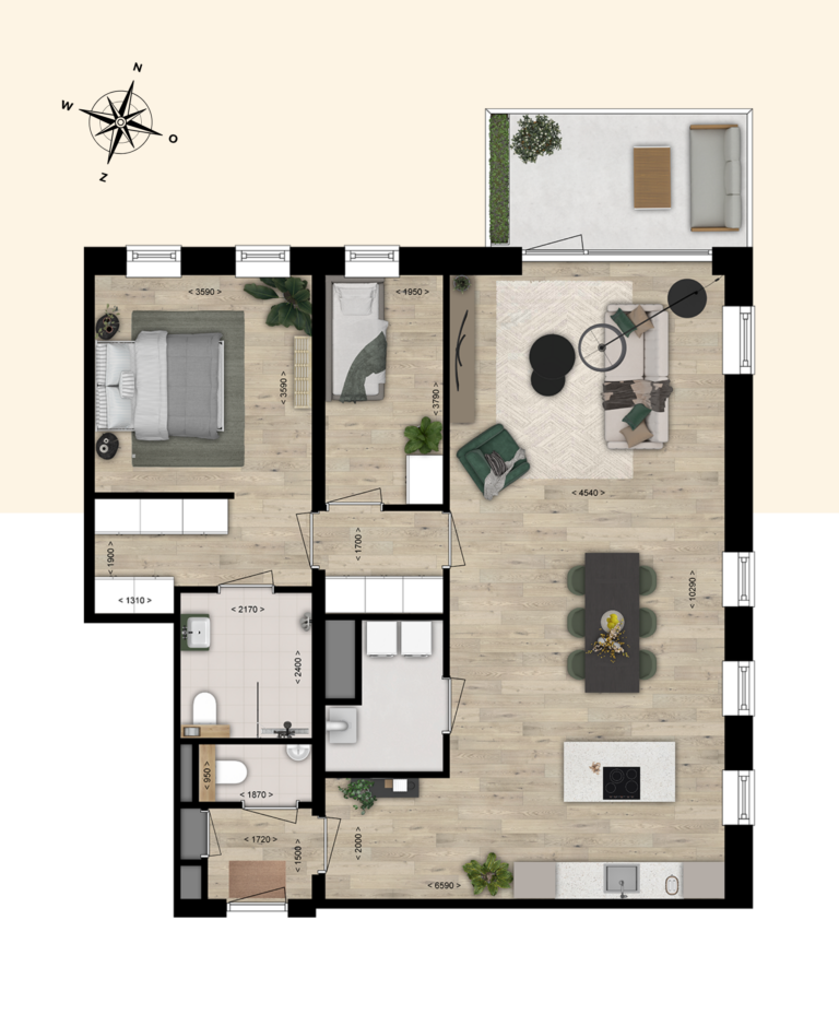 Het appartement beschikt over twee slaapkamers, een luxe badkamer en een apart toilet. Daarnaast is er een extra technische ruimte met aansluitingen voor onder andere de wasmachine. De ruime, open woonkamer met moderne leefkeuken biedt directe toegang tot het balkon.