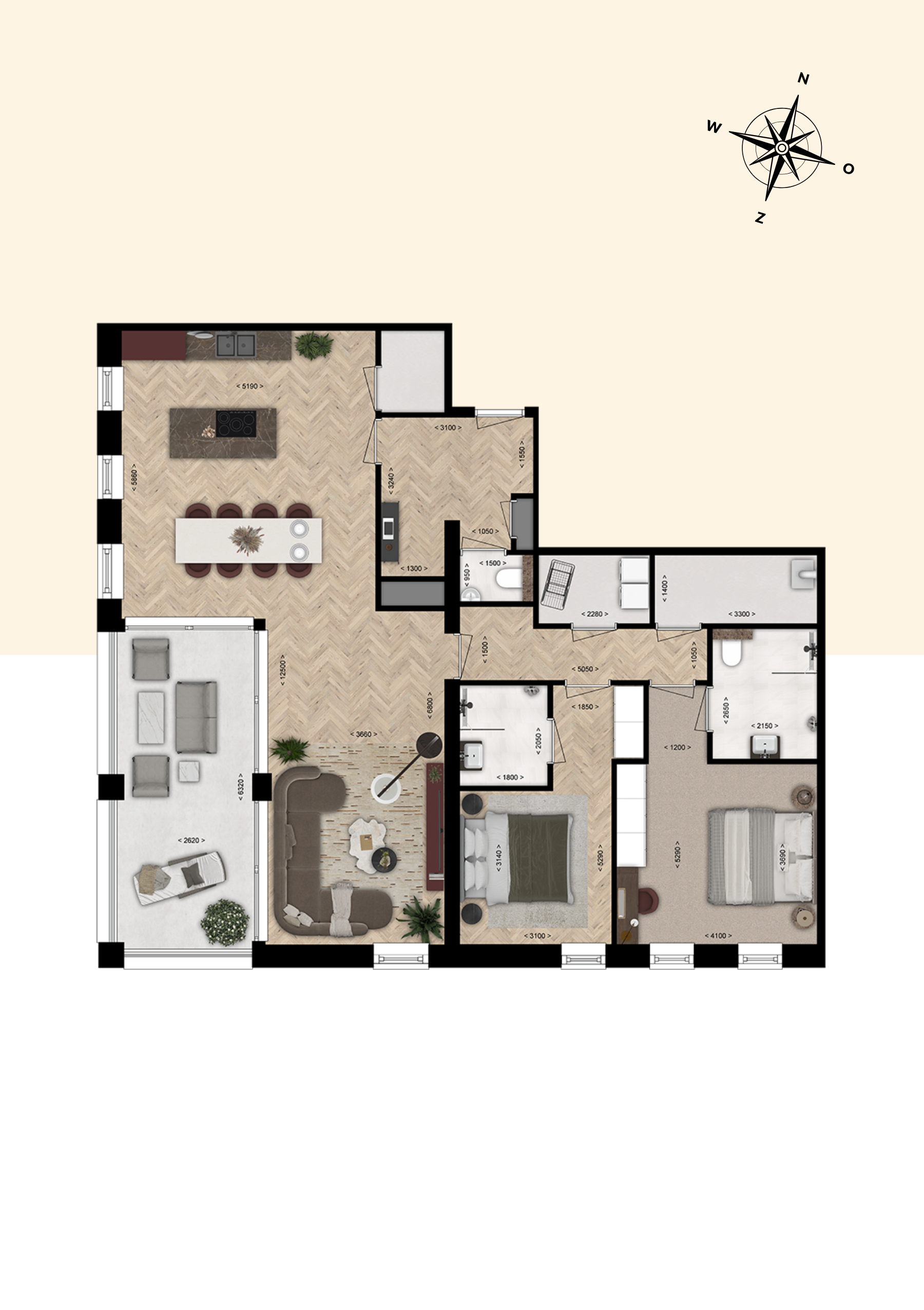 Het penthouse beschikt over een riante master-bedroom, een extra slaapkamer en een aparte wasruimte. Daarnaast zijn er twee luxe badkamers en een apart toilet. De ruime, open woonkamer met moderne leefkeuken biedt directe toegang tot het royale balkon.