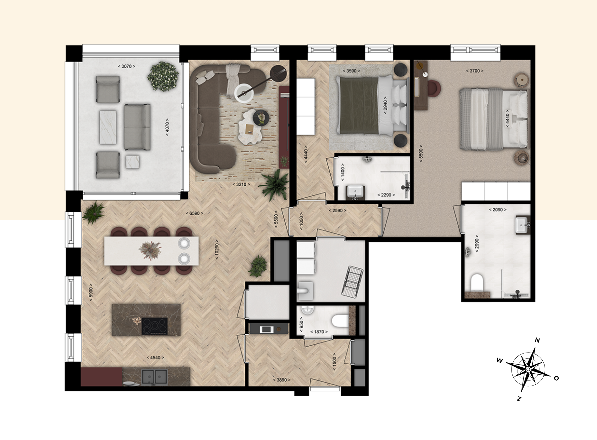 Het penthouse beschikt over een riante master-bedroom, een extra slaapkamer en een aparte wasruimte. Daarnaast zijn er twee luxe badkamers en een apart toilet. De ruime, open woonkamer met moderne leefkeuken biedt directe toegang tot het royale balkon.