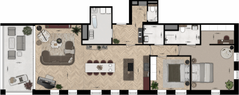 Het penthouse wordt compleet opgeleverd; keuken en badkamer zijn inbegrepen in de v.o.n.-prijs. Daarnaast beschik je over een eigen berging en een privé parkeerplaats.