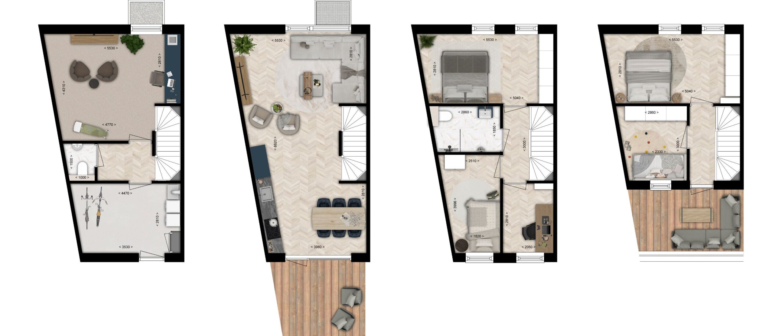 Verdeeld over vier lagen combineert de woning comfort en flexibiliteit. Het souterrain heeft een royale ruimte die uitstekend dienst kan doen als thuiskantoor, hobbyruimte of extra leefruimte; daarnaast is er een apart toilet, berging en ruimte voor witgoed. Op de begane grond vind je een lichte, open woonkamer met keuken, van waaruit je via grote deuren direct het terras bereikt. Op de eerste verdieping vind je een grote master-slaapkamer en twee kleinere kamers. Op de tweede verdieping vind je een grote slaapkamer. een kleinere kamer en een dakterras.